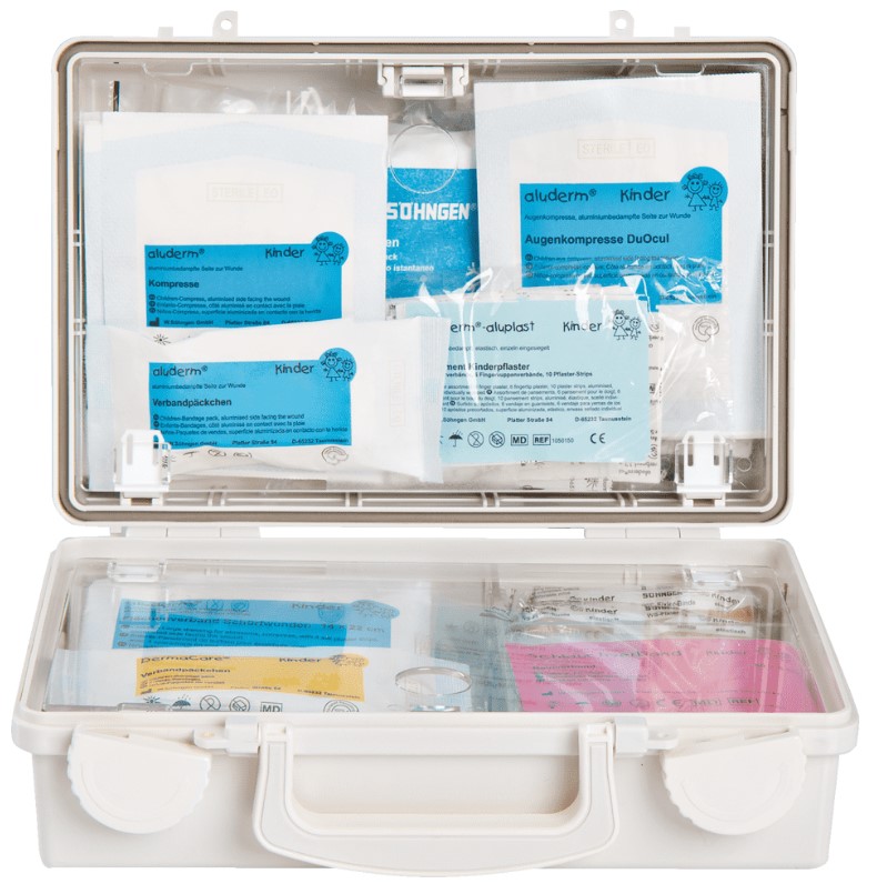 Der hochwertige Söhngen® Erste-Hilfe-Koffer Quick-CD 'kleine GROSSE Hilfe Kindergarten' verfügt über eine Spezialfüllung in altersgerechten Größen für Kinder bis 6 Jahre. Im Inneren des weißen Koffers teilen herausnehmbare Kunststoff-Stege den verfügbaren Platz ein, so dass das reichhaltige Verbandmaterial übersichtlich und ordentlich einsortiert werden kann, transparente Abdeckplatten schützen den Inhalt vor Staub und Schmutz und sorgen dafür, dass im aufgeklappten Zustand nichts herausfällt. Die ansprechende und kindgerechte Gestaltung mit bunten Kinderzeichnungen animiert zum Lachen, lenkt ab und nimmt so die Ängste vor und bei der Wundversorgung.