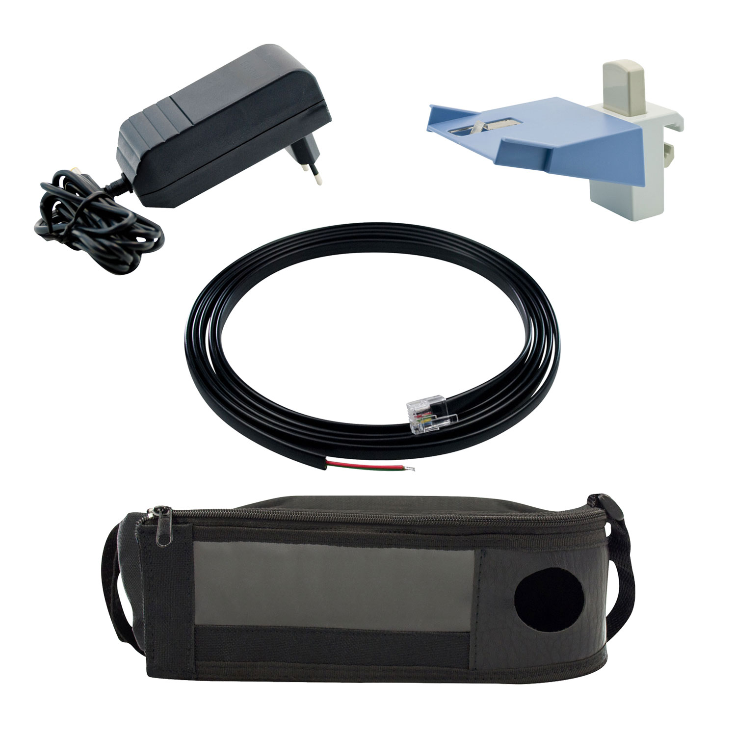 Umfangreiches Zubehör (Tragetaschen, Netzteile EU, Halterungen sowie Fernalarm-Anschlusskabel für die stationäre Anwendung) passend zum HUM AEROcheck® sat805 Pulsoximeter.