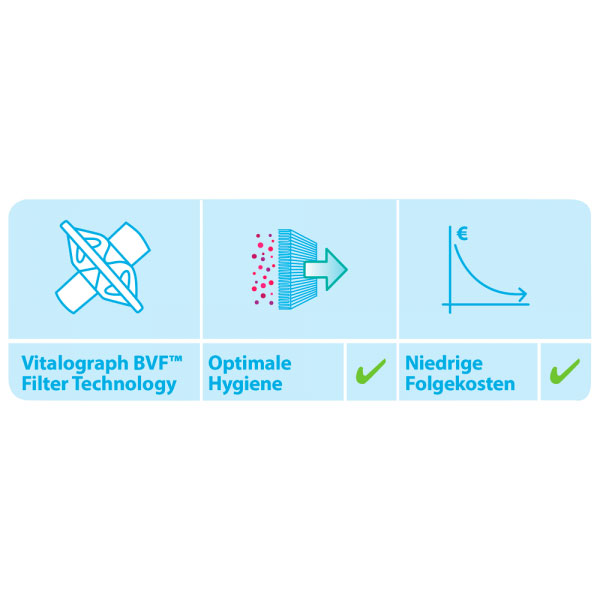 Zum Schutz von Patienten und Personal kommen hochwirksame Vitalograph BVF™ Bakterien-Viren-Filter mit einer Effizienz von 99,999% zum Einsatz. Damit arbeiten Sie sicher nach aktuellen Hygienestandards und gemäß der Experten-Empfehlungen nationaler und europäischer Fachgesellschaften. Außerdem profitieren Sie von sehr niedrigen Testkosten pro Patient, da keine weiteren Einmal-Artikel wie Adapter, Atemrohre oder andere Mundstücke benötigt werden.
