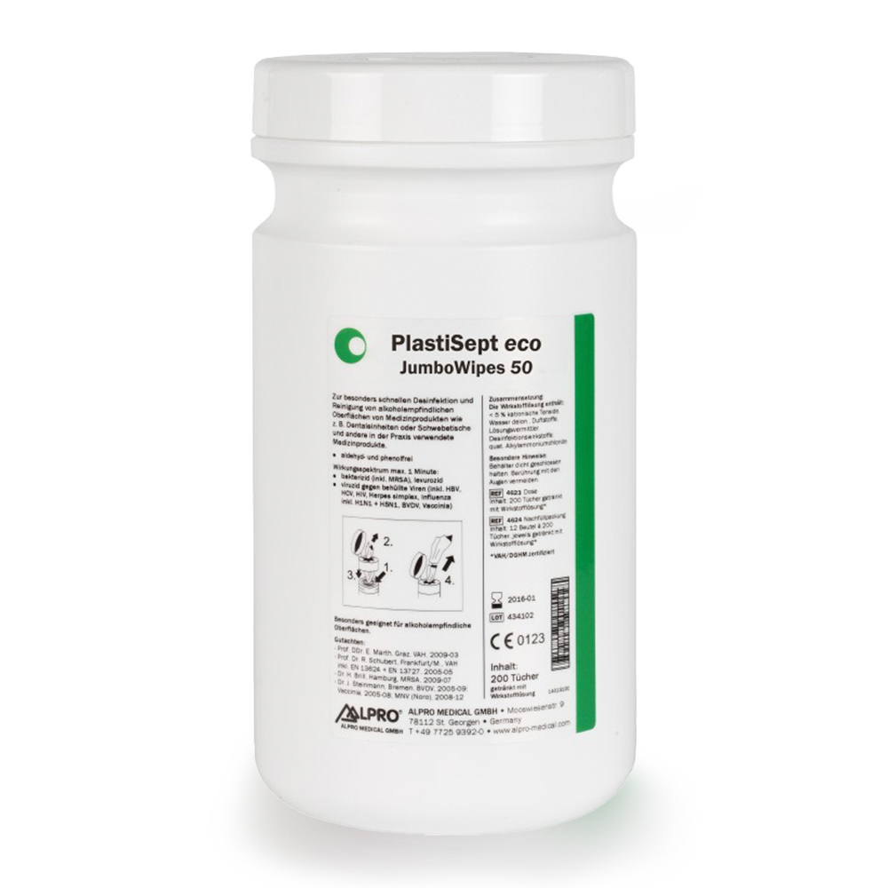 Alkoholfreie Feuchttücher zur Reinigung und Desinfektion von empfindlichen Oberflächen von Medizinprodukten, wie z. B. ärztliche und zahnärztliche Behandlungseinheiten (inkl. Sitzpolster und Schwebetische) und Röntgengeräte insbesondere mit Plexiglas- oder Metalloberflächen. Wirkt Bakterizid, Fungizid, begrenzt viruzid. Wirkstofflösung durch VAH/DGHM als Flächendesinfektion mit Mechanik zertifiziert. Schaumdüse vermeidet Schleimhautreizung durch Aerosolbildung. Aldehyd-frei QAV-frei.