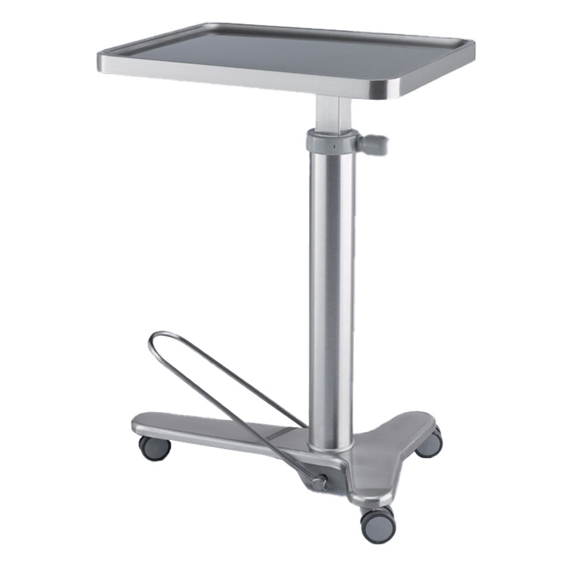 Mit Fußpumpe, Höhenverstellung durch Trittbügel von 950 bis 1350 mm, nahtlos tiefgezogene Tischplatte aus Chromnickelstahl 18/10, 700 x 500 mm mit 15 mm hohem Rand, abnehmbar, 360° drehbar und in jeder Position fixierbar, Kanten und Ecken abgerundet, Standrohr und Tragrahmen aus Chromnickelstahl 18/10, Fußgestell mit Chromnickelstahlverkleidung, geschlossenen Kunststoffdoppelrollen Ø 75 mm, kugelgelagert, elektrisch leitend, rostfrei. Sichere Arbeitslast in jeder Position der Tischplatte: 30 kg