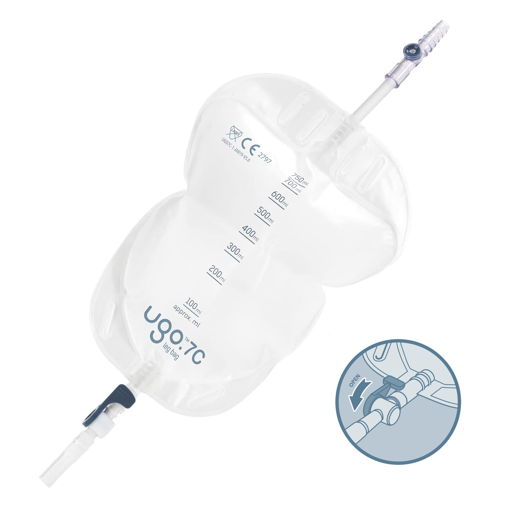 Ugo 7C, Beinbeutel 750 ml, 5cm, Schwenkh (10 Stck) steril, Schlauch 5 cm, mit Textilbeschichtung