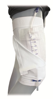 In der Oberschenkelstulpe aus weichem waschbaren Baumwollmischgewebe mit integrierter Beinbeuteltasche sind Silikonstreifen eingearbeitet, die einen bestmöglichen Halt der Stulpe selbst beim gefüllten Beinbeutel ermöglichen.
