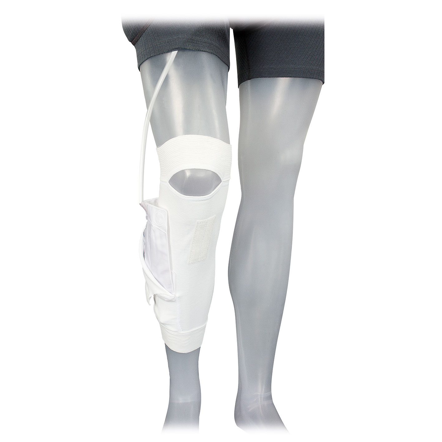In der Unterschenkelstulpe aus weichem waschbaren Baumwollmischgewebe mit integrierter Beinbeuteltasche sind Silikonstreifen eingearbeitet, die einen bestmöglichen Halt der Stulpe selbst beim gefüllten Beinbeutel ermöglichen.