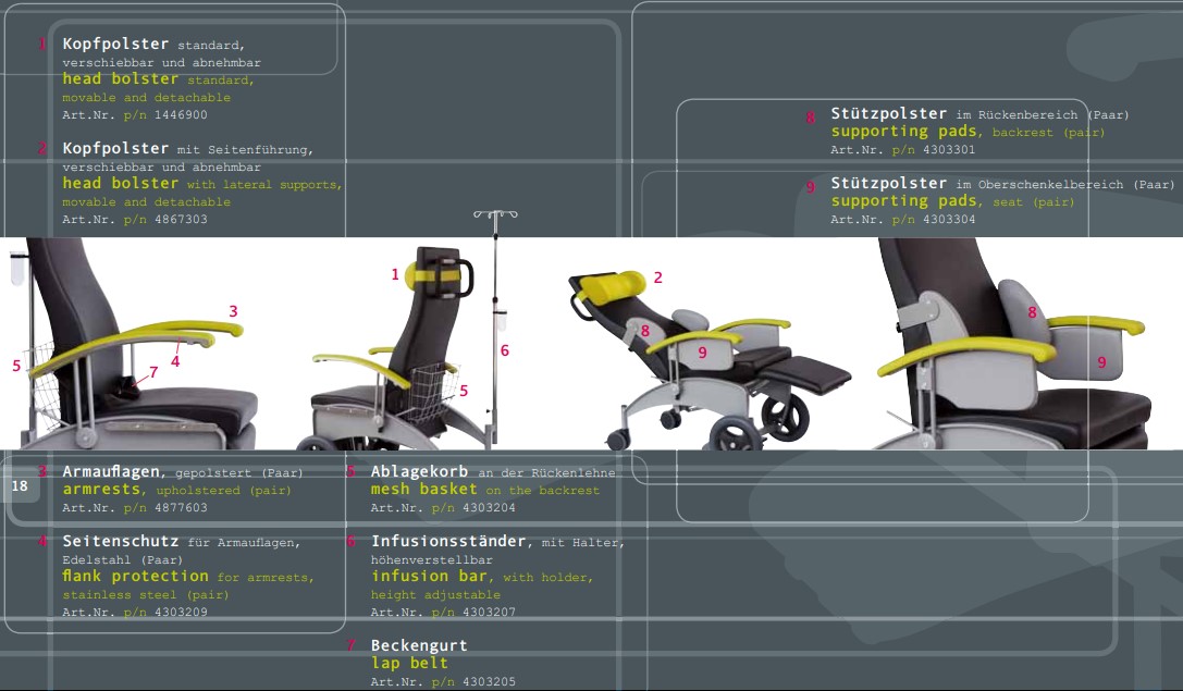 - Kopfpolster Standard Kopfpolster mit Seitenführung verschiebbar und abnehmbar Armauflagen gepolstert (links und rechts; Seitenschutz für Armauflagen, Edelstahl)