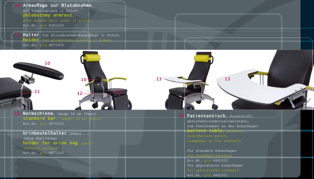 - Patiententisch (Kunststoff, desinfektionsmittelresistent lackiert, zum Festklemmen an den Armauflagen)