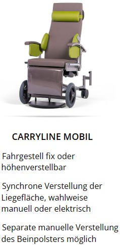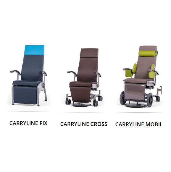 Die medizinischen Liegen und medizinischen Stühle unseres Partners GREINER stehen für höchste Qualität und maximal anwendungsorientiertes Design, made in Germany. Die Stühle der CARRYLINE Serie können sehr vielfältig eingesetzt werden, z. B. als Ruhesessel zum Sitzen oder Liegen, oder als Patientenstuhl für verschiedene diagnostische Settings. Die zweiteilige Rückenlehne mit abschwenkbarem Kopfteil ermöglicht ein Arbeiten von hinten, beispielsweise bei neurologischen Untersuchungen wie EEG. Die drei verschiedenen CARRYLINE Varianten FIX, CROSS und MOBIL und unterschiedliches Zubehör passen sich dabei den unterschiedlichen Platz- und Anwendungsanforderungen variabel an. Basis aller carryLine- Modelle ist ein massiver Stahlrahmen. Die Liegen besitzen eine niedrige Sitzhöhe und ein Wadenbrett mit Negativneigung für ein bequemes Ein- und Aussteigen. Die automatische Stufenlagerung der Liegefläche um 10° bietet eine entspannte Liegeposition, verhindert ein Abrutschen des Patienten und bewirkt eine Entlastung der Knie. Die Armlehnen lassen sich bei allen Modellvarianten vollständig abklappen und ermöglichen so den freien Zugang. Die Rückenlehne mit anatomischer Formgebung und Seitenhalt lässt sich synchron mit dem Beinpolster manuell oder mit elektromotorischer Unterstützung verstellen. Verschiedene Rückenlehnen können wahlweise kombiniert werden um die Liege für den individuellen Einsatzzweck zu optimieren. Die einteilige Rückenlehne mit gummiertem Schubbügel, die kürzere Rückenlehne mit zylindrischer um 25cm ausziehbarer Nackenrolle bzw. die einteilige Rückenlehne, deren oberer Bereich sich um ca. 100° nach hinten abklappen lässt. Wahlweise können die fahrbaren Modelle mit einer schwenkbaren Fußstütze ausgestattet werden. Sie senkt sich beim Auftreten (z.B. beim Ein- und Ausstieg) ab und sichert die Liege bei Belastung gegen das Kippen. Bei Nichtgebrauch kann sie unter die Liege geschwenkt werden.