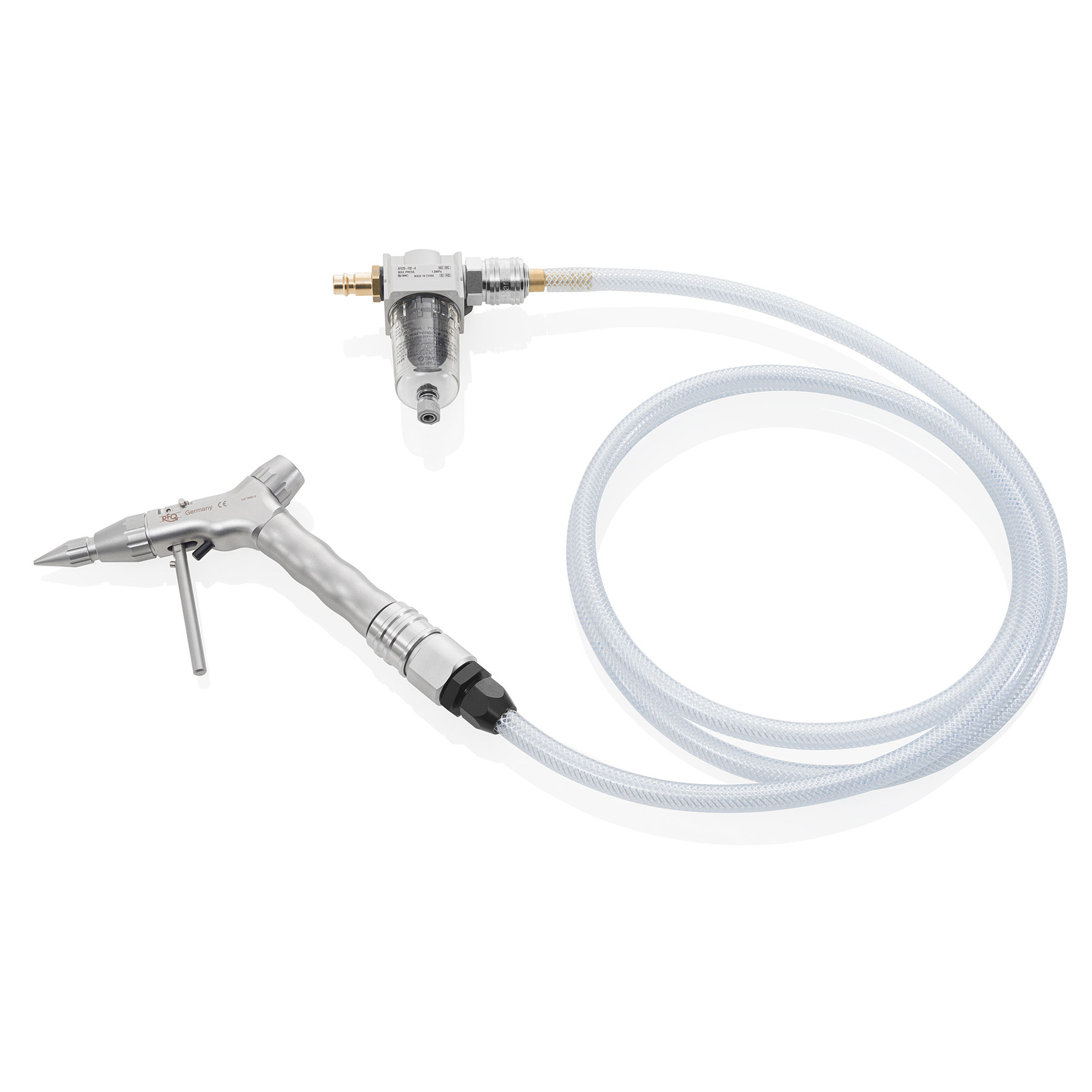 Die Druckluftpistole inklusive Spritzdüse bestehen aus Edelstahl und sind als Medizinprodukt Klasse I zugelassen.