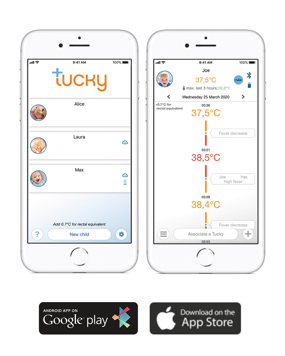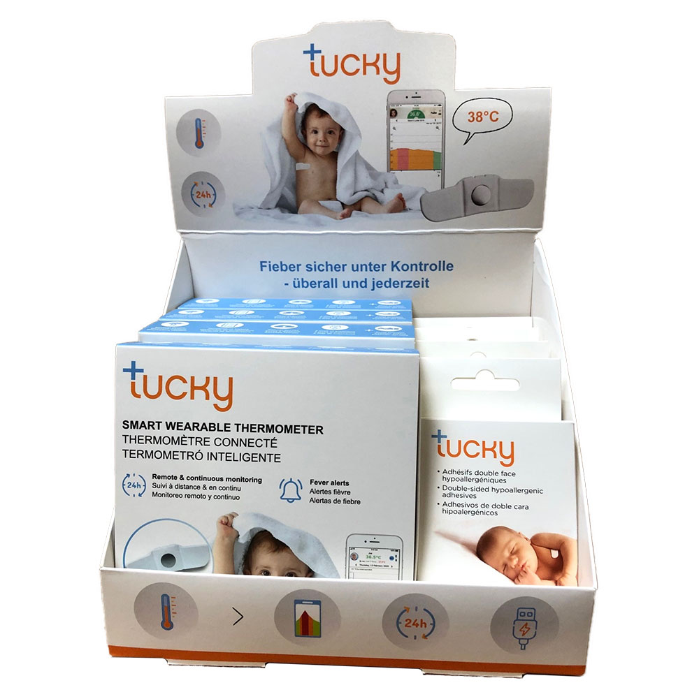 Tucky ist ein tragbares Thermometer für die kontinuierliche Temperaturmessung und -aufzeichnung aus der Entfernung bei Jung und Alt, sowie für die Benachrichtigung bei einem Lagewechsel von Säuglingen. Alle Informationen haben Sie jederzeit und überall in der App auf Ihrem Smartphone verfügbar.