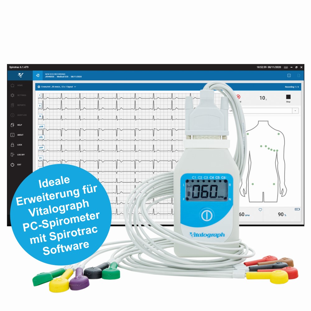 The Vitalograph® BT12™ in combination with our newSpirotrac® 6 software is a powerful resting ECG solution for PC, laptop and tablet. The lightweight, compact design and Bluetooth connectivity make it ideal for stationary and mobile ECG measurements. The wireless transmission of the ECG curve provides excellent signal quality with fewer artefacts.