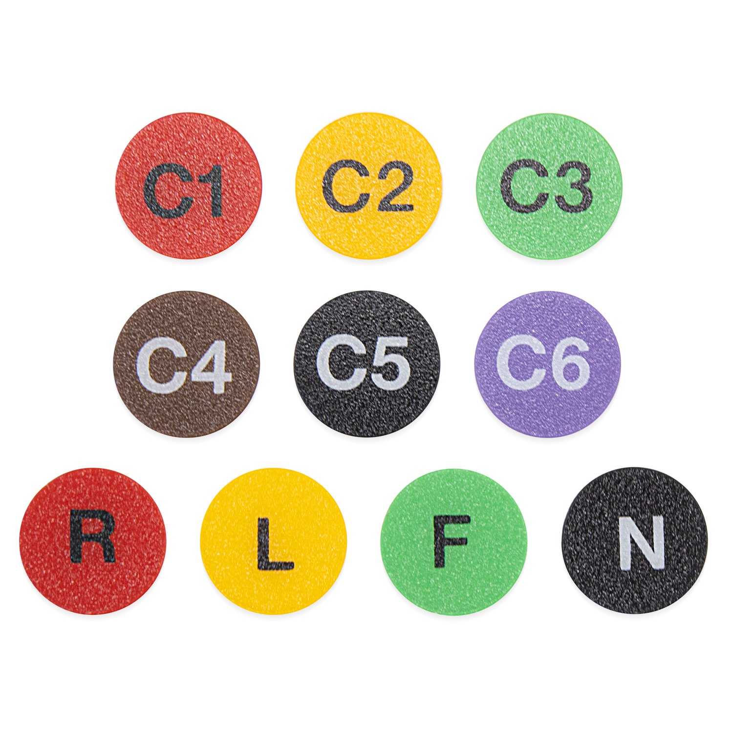 Coding discs for suction systems for identifying the discharges; 10 pieces in a SET (R,L,F,N, C1- C6).