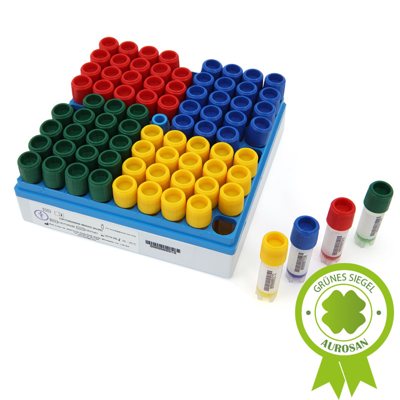 The medical device Cryobank® - 80 mixed tubes with cryo medium has been awarded the green AUROSAN seal because it is reusable and thus the use of disposable items and the generation of large amounts of waste is avoided.