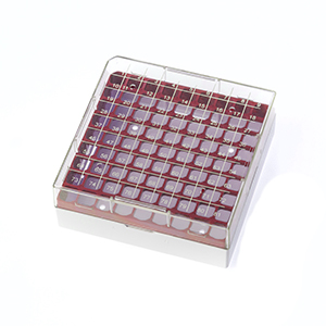 A storage bin for the cryotube system for a total of 81 tubes. The individual compartments are bar-coded, which makes it easier to distinguish between them.