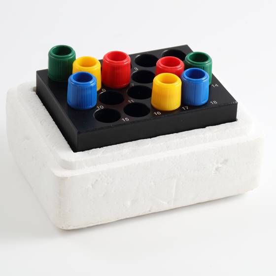 The cryoblock with styrofoam coating is used to safely transport the inoculated and frozen cryotubes from the freezer to the workplace and protects the tubes from thawing during this time. This means that the tubes remain frozen and the cells stable even after 45 minutes of transport. Without using the cryoblock, the cells are already thawed after 3 minutes.