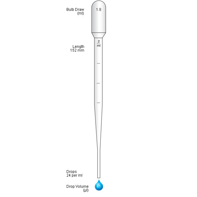 because they are made from soft, low-density polyethylene, can be recycled when used with non-hazardous samples< /li> - Length: 152 mm, capacity: 1.8 ml, drops per ml: 24, drop volume: 41 µl, graduation at: 0.5 ml