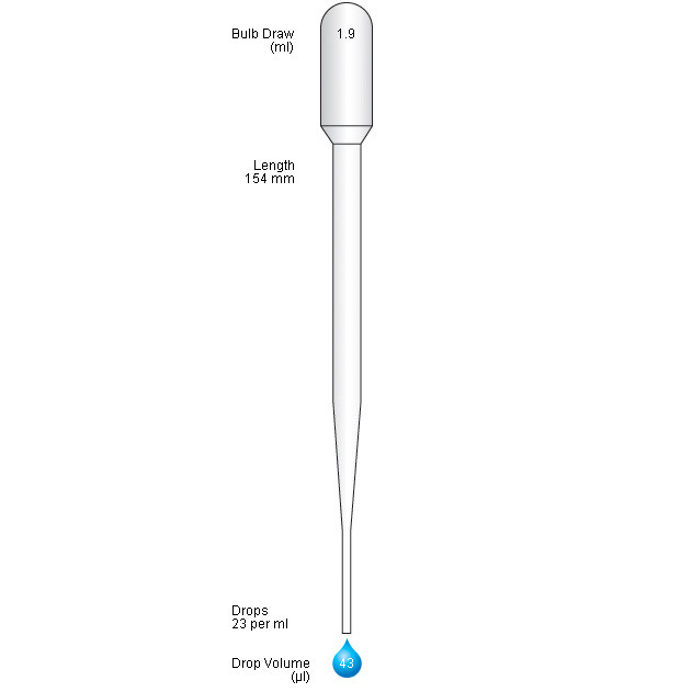 as they are made from softer density polyethylene they will be recycled if used with non-hazardous samples - Length: 154mm Capacity: 1.9ml Drops per ml: 23 Drop volume: 43µl