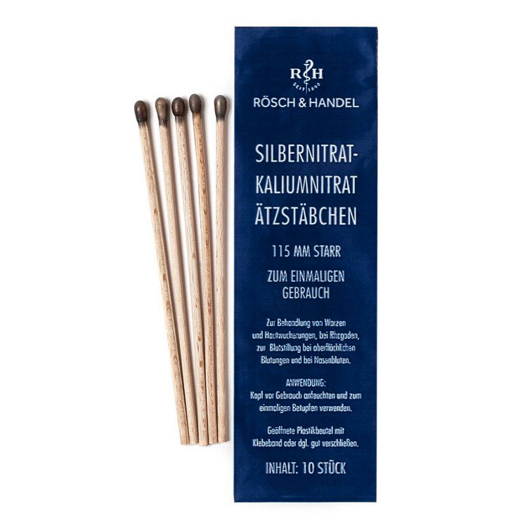 silver nitrate / potassium nitrate etching pen, L 115mm These etching pens are suited for the removal of granulation tissue associated with wound healing (caro luxurians), e.g. after the placement of transcutaneal catheters, PEGs etc. Only with doctor`s advise, they may also be used > for the treatment of certain warts; > for the removal of small leftovers of the umbilical cord with newborn babies; or > for hemostasis with small, superficials wounds How to use Follow your doctors` advise and the instructions for use. Wetten the head of the pen with a few drops of tap water and carefully swap the relevant area of the wound. Let it react. The treated areas will turn black soon, and over a couple of days will be separate from the surrounding non-granulating tissue. Following doctors` advise, multiple treatment may be necessary. Content The head of an etching pen contains 50% silver nitrate and 50% potassium nitrate. One pack contains 10 elastic etching pens, single-packaged.