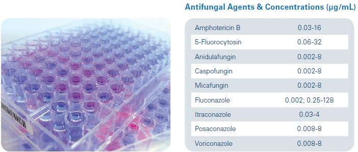 The MICRONAUT-AM AFST plate permits the easy determination of MIC of the following 9 antifungal agents against yeast or cryptococci with the MICRONAUT system: